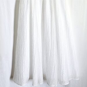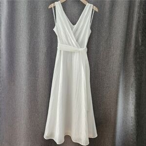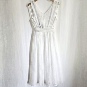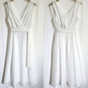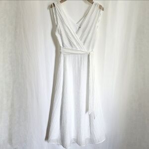 Halston White Sleeveless Seersucker Belted Flare Midi Dress