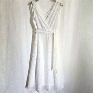 Halston White Seersucker Belted Sleeveless Flare Midi Dress