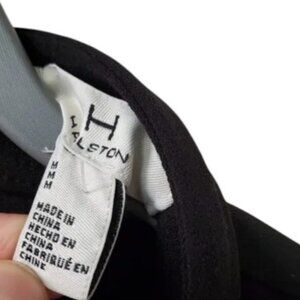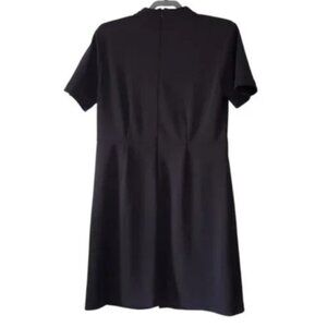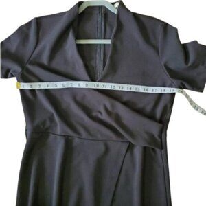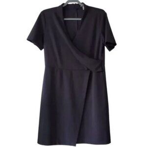 A black wrap dress by H by Halston. Features short sleeves, a V-neckline and skirt with wrap accents, and falls just above the knee. H by Halston is known for creating versatile and wearable pieces. This dress can be dressed up or down, suitable for both casual and more formal occasions.