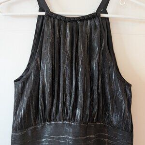 Halter top with ribbon detail. Shimmery silver skirt. Lined; zip back. 13.5" waist. 34" from collar to hem.