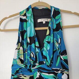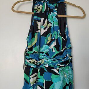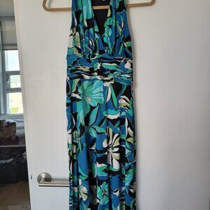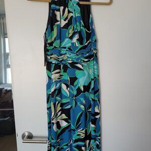Flowery long length dress, halter top, defined waist; top is completely lined; with a wide defined cummerbund-like waist;