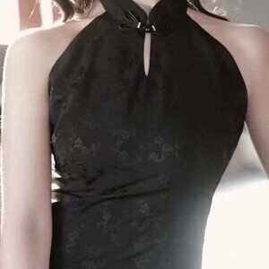 Black jacquard halterneck dress, for dailywear and party. Kind of vintage and chic style.
