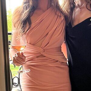 This dress is gorgeous on, but on the rack it looks very confusing and is sort of confusing to put on-but once on hugs ALL the right places and is the prettiest ballet pink colour. Worn once by me- bought from a luxury consignment store in Toronto. The tag says it is a Large but I am very much a standard size small- 5'6 and 25' waist, 32inch bust. This is a perfect dress to wear as a wedding guest.