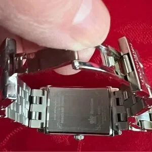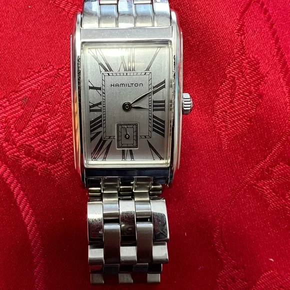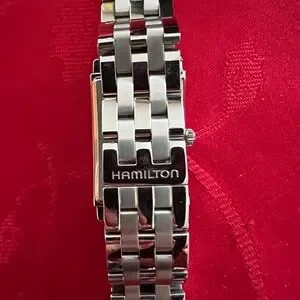 Elegant Hamilton watch with a silver tone. Features a classic rectangular face and Roman numerals. Like new condition!
