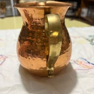 Enhance your home decor with this elegant hammered copper pitcher. Featuring a stunning brass handle, this piece adds a touch of sophistication to any setting. Perfect for displaying flowers or as a standalone accent.