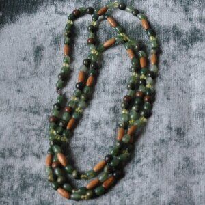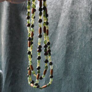 Hand Beaded Long Stand Necklace Wooden & Green Beads Mixed Medium Boho 30"