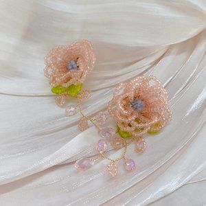 Hand Beaded Pink Flower Earrings
