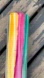 Tall glass vase with bold stripes. Features pink, green, and yellow hues. Ideal for adding color to any space.