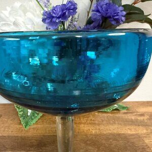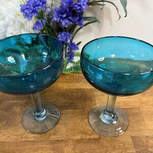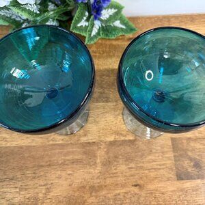 This elegant pair of hand-blown blue coupe glasses showcases the distinct artisan style often attributed to Biot glassware from France. Each piece features a vibrant deep turquoise bowl and a clear stem filled with tiny air bubbles, giving it both visual character and historical charm. These are perfect for collectors of unique mid-century or coastal glassware.