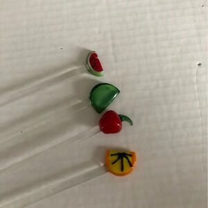 Adorable little orange slice, lime slice, watermelon slice and apple atop of clear swizzle sticks. Each is hand crafted and therefore there are some size differences from one to the other.