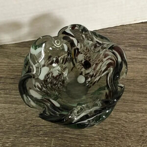 Splatter type effect with purples and white, a tiny bit of orange mixed in there too. Smooth but unpolished bottom. Excellent condition- no chips or cracks. Unsure on manufacturer but absolutely is hand blown and very good quality.
