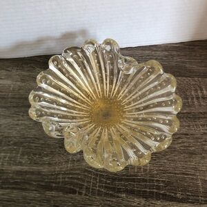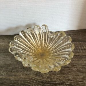 Beautiful glass bowl with intricate gold accents. Perfect for decor or use as a candy dish or trinket dish. Highly polished bottom and very heavy. Because there is no sticker or signatures I cannot confirm a maker but it is very good quality and was completed by a skilled glassblower. Bubbles are evenly spaced and the gold flake is very consistent throughout.