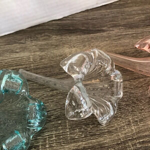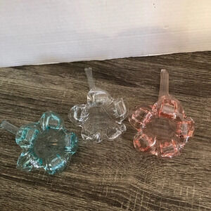 One clear glass, one blue and one pink. All the same size. Excellent quality, heavy glass. The end of the stem is closed so it is not useable as a watering tool. Excellent condition no chips or cracks.