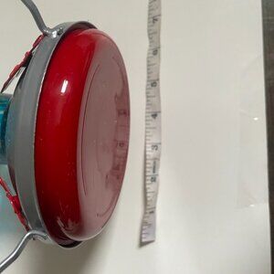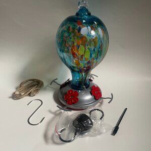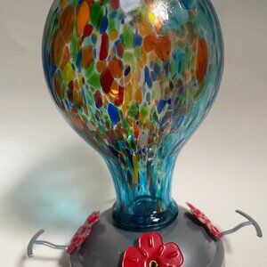 Beautiful hand-blown glass feeder with vibrant multi-color detailing and red flower feeding ports