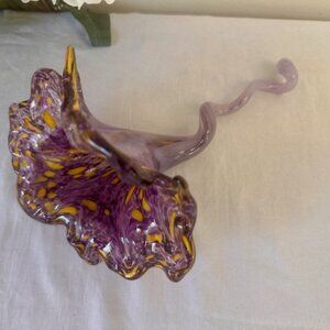 Hand Blown Murano Style Trumpet Dish Purple Yellow Swirl Glass Art MCM Italian