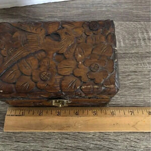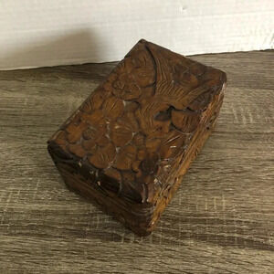 Solid wood carved box. Bird with flower design. Likely hand made in an Asian country due to the style and material. I believe this likely is a vintage piece but I cannot confirm that. Good preloved condition, a couple of minor issues but nothing major. Really pretty piece and very detailed.