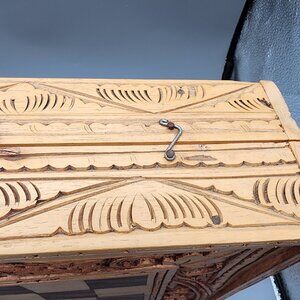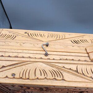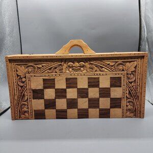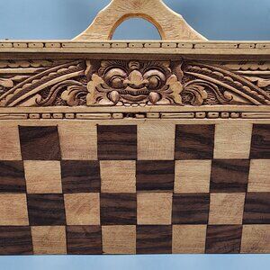 Beautifully handcrafted wooden chess and backgammon combo set with intricate Balinese-style carvings. Includes full set of carved wooden pieces (black and red), secure metal latches, and inner storage compartment. The board folds with a handle for easy transport. Unique decorative and functional piece.