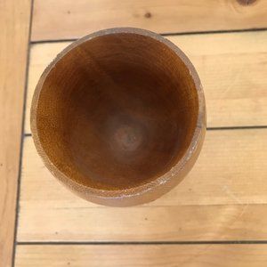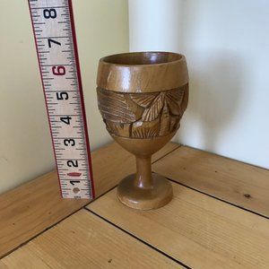 Hand carved wooden cup on stemmed base has palm tree village design around the outside. 6" tall x 3 1/4" across top x 2 1/2" across base. Pre-owned condition, some surface wear (small scratches/scrapes to wood finish).