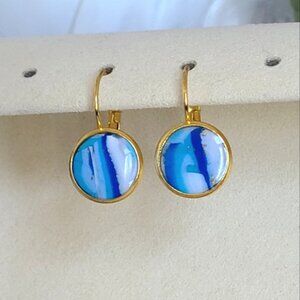 Elegant Hand Crafted Boho Gold Blue White Gemstone Marble Circle Drop Dangle Earrings