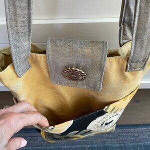 Hand Crafted Fabric Abstract Floral Print Tote Bag w Pockets Yellow Grey Blk