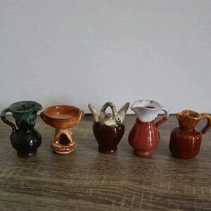 Pottery pitchers glazed in various colours. Adorable addition to a dollhouse or even use some as a bud vase. Regardless of what you use them for, they are still very unique and one of a kind!
