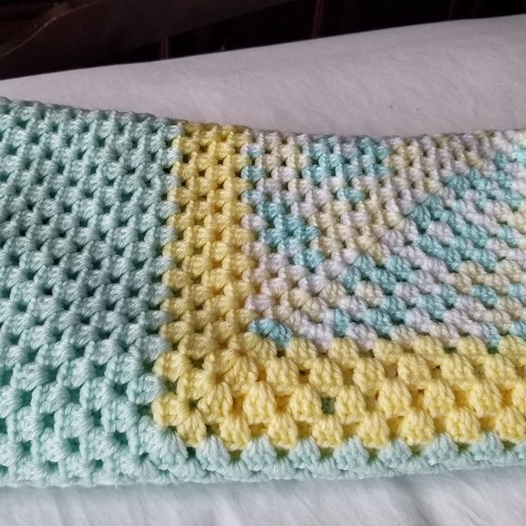 Hand Crochet Granny Square Baby Afghan Pastel Yellow and Teal Stroller Blanket