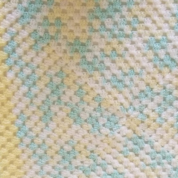 Vintage soft, hand crochet knit Granny Square baby afghan in coordinating white, teal and pastel yellow colours . The size is width 35'' and length 36'' ideal for baby prams and strollers to keep that little one warm and cozy on walks . Made with soft baby acrylic yarn. Hand wash or machine delicate cycle recommended. Heirloom crochet knit baby afghan knit with love and in pristine condition.