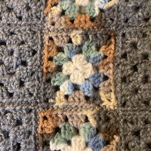 Vintage Hand Crochet Hippie Granny Square Earth Tones Boho Top Patchwork Sweater Vest. Two shades of grey, green, blue, white and 2 shades of brown.
