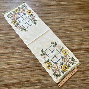 Hand Embroidered Flower Swag Table Runner Vintage Cotton w/ Fringe Ends 15x46"