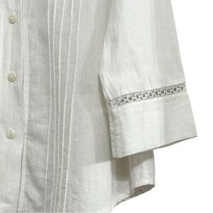 White cotton blouse featuring colorful hand embroidery, lace trim, pintuck pleats, and a button-front closure in a relaxed fit. Made from manta, a soft cotton fabric often used in traditional Mexican clothing. It feels light, a little textured, and lets your skin breathe — comfy, cool, and easy to wear all day.