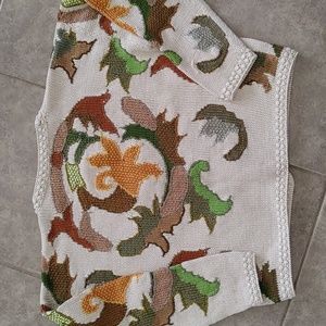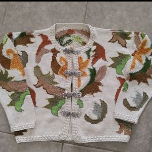 Exceptional cotton sweater-cardigan with beautiful embroidery. No label. Peacock metal clip buttons. Two small stains- see last 3 photos. Buttoned bust is 36 inches. Length from shoulders is 17.5 inches. Sleeves are 17 inches...shoulders slightly hang, so at least an inch can be added. Shoulders across are 19 inches.