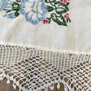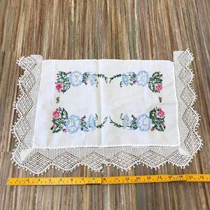 Hand Embroidered White Cotton Vanity Dresser Table Mat Crochet Trim Blue Floral