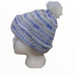 This hand-knit beanie is crafted from durable acrylic yarn and adorned with a faux fur pom pom. Designed for warmth, it features a double-layer design in soothing shades of white, grey, lilac, and periwinkle. Ideal for both youth and adults, it fits most sizes comfortably.
