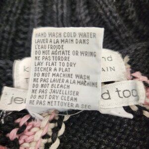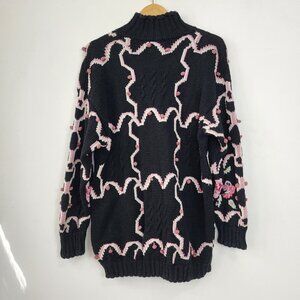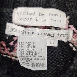 hand knitted sweater, black floral sweater, buttoned collar sweater, Jennifer Reed Too, 2X knitwear, floral pattern pullover, pink accents sweater, ribbed hem knitwear, Hong Kong made sweater, cozy warm sweater, ramie cotton blend, winter knit sweater, textured floral design, Vintage, 1990s, Hand Knit, Shabby Chic, Cottagecore, Embroidered Flowers
