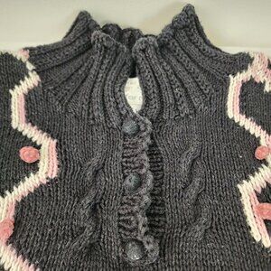 Hand Knit Black Sweater 2X Pink Floral Design Button Collar Shabby Chic Cottage