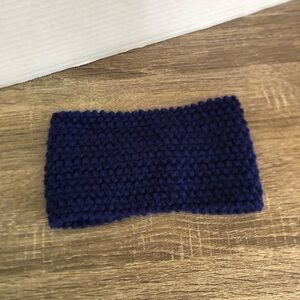 Cozy navy blue hand knit headband featuring a decorative button in the middle. Knot/twist design in the front.