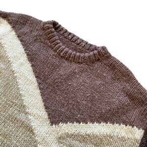Hand knit pullover sweater has brown & beige colorblock design. Crew neckline, long sleeves. Loose/oversized fit. Hand made, no tags, feels like acrylic. Hand wash or machine wash on gentle/hand wash setting, lay flat to air dry. Fits like a women's relaxed fit Large, see below for garment measurements.