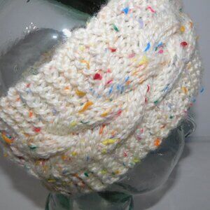 This super fun hand Knit Cream Multicolour Candy Confetti Yarn Winter Headband is in great clean bright condition. Yarn is an acrylic polyester blend. Headband is 4.5" wide