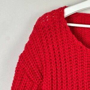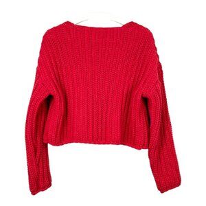 Hand Knit Cropped Large Button Cardigan Red. Large knit. Cropped length. Two front patch pockets. Large gold coloured buttons. Crew neck. Drop shoulder. Hand knit so size is a guess. Please check measurements carefully prior to purchasing. Material unknown, but feels like acrylic. No known flaws.