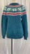 This sweater is handmade with a Fair Isles-style snowflake motif. The green yarn in the sweater has a soft sparkle flecked throughout. Material is unknown.