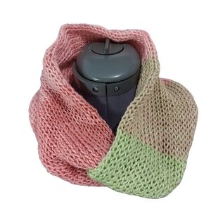 This hand knit infinity cowl is crafted from 97% acrylic and 3% foil yarn featuring shades of dusty rose, sage green, and silver for a unique look. It offers warmth with its double-layered design and a stretchy fit suitable for most adults.
