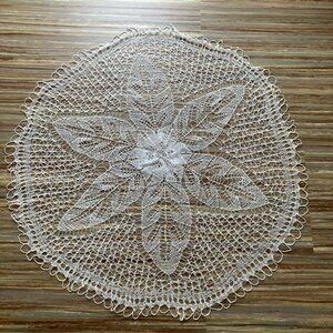 Hand Knit Lace Flower Star Round Tablecloth Vintage White Delicate Doily 42"