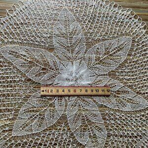Unique, beautifully crafted hand KNIT (not crochet) lace tablecloth in a delicate flower/star pattern with scalloped edging. A lovely piece that would have taken a skilled knitter to complete. Knit with fine lace-weight yarn. Very good pre-owned hand made condition. Approx. 42" across including the scalloped edging.