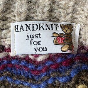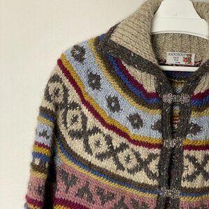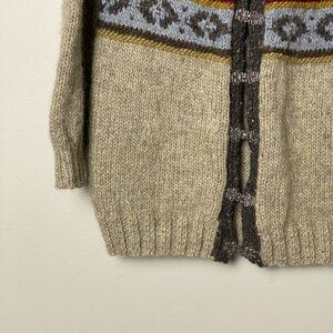 Hand Knit Mixed Stitch Wool Blend Fair Isle Print Cardigan. Heavy wool yarn blend with, I am guessing, either alpaca or mohair because of the wispy bits. Earth tone fair isle print across top half. Hook closures down front. Ribbed cuffs, hem, and collar. Definitely feels like Shetland wool. Has a bit of itch to it. Hand made so size is a guess. Please check measurements carefully prior to purchasing.