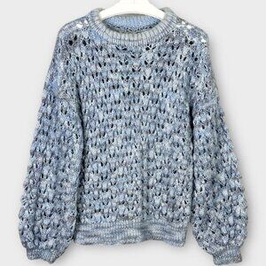 Hand Knit Open Knit Crew Neck Sweater. Blue and grey mixed yarn. Open knit. Drop shoulder. Balloon sleeves. Ribbed collar, cuffs, and hem. Hand knit so size is a guess. Please check measurements carefully prior to purchasing. Unknown material content, but would probably guess acrylic. No known flaws.
