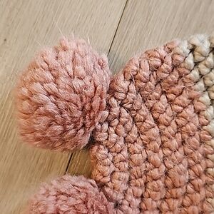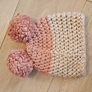 Handmade Chunky Knit, Thick Toque with 2 pink Pom Pom Ears. top is pink and lower half is an oat cream color. no brand, size, or material tag. I would guess it fits 0-6 months (potentially bigger) -- size is just a guess !!