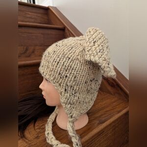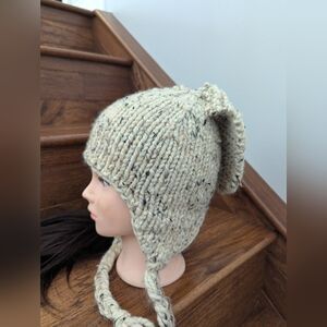 Hand Knit Rabbit Hat Adult OS Wool Blend Cream With Black and tan Accents. Ear flaps and tassel ties.
