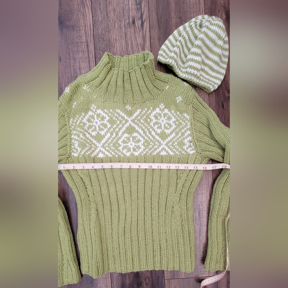 Hand knit green and white ribbed sweater with matching hat. Machine washable lay flat to dry.