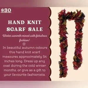 Hand knit ruffle scarf in multiple colours. Measures approximately 54” long.
