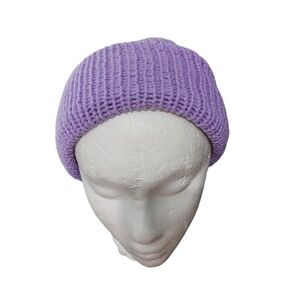 This reversible slouchy hat features shades of lilac and light grey, knit from 100% acrylic yarn, offering comfort and style for most adult sizes.